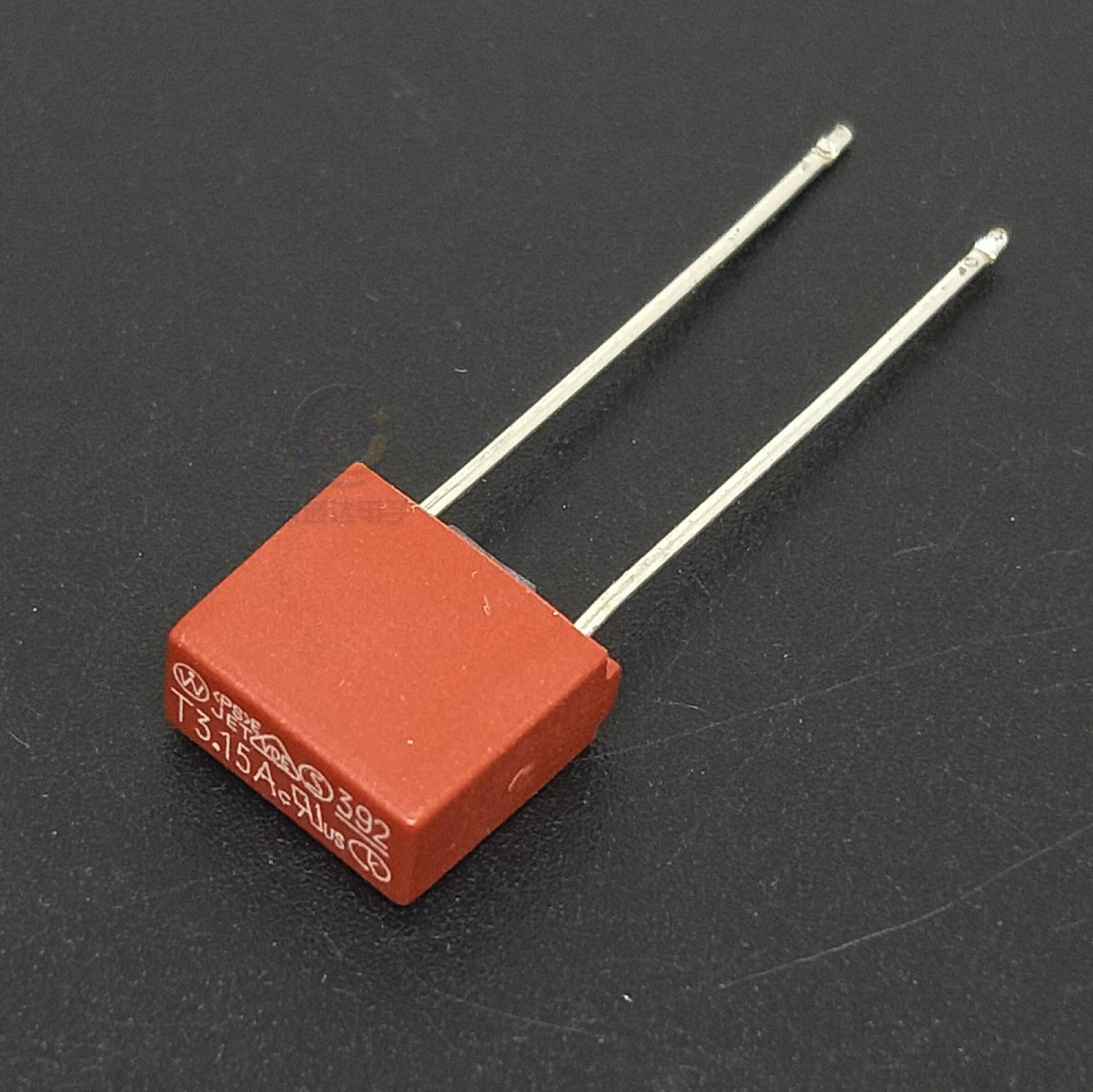 保險(xiǎn)絲兩引腳間連接著一段易熔合金絲,特殊樹脂包覆著易熔合金絲,電流可以從一根引腳流向另一根引腳,當(dāng)保險(xiǎn)絲周圍溫度上升到它的動(dòng)作溫度時(shí),其易熔合金熔化并在表面張力作用下及特殊樹脂幫助作用下,收縮成球狀附在兩引腳末端。這樣,電路被永久切斷。