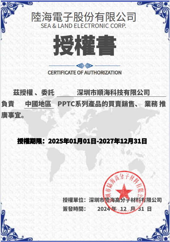 陸海電子已授權(quán)順海為其代理商已更新(2025年1月~2027年12月)