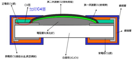 厚聲抗硫化電阻器 C1 電極含鈀。普通品 G2 保護(hù)層和鎳錫層之間容易產(chǎn)生縫隙,抗硫化產(chǎn)品增加了 C4 層,C4 層與 G2 層不會(huì)產(chǎn)生裂縫(同種物質(zhì)的結(jié)合)可有效阻止外界物質(zhì)進(jìn)入,所以產(chǎn)品 C4起到預(yù)防銀遷移和抗硫化的作用。