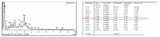 正電極斷開處鍍層下方銀層被腐蝕物質(zhì)的成份用 SEM 測(cè)量,測(cè)量被腐蝕處含有硫。成分具體如圖 5 所示。