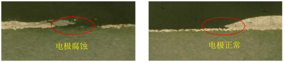 (圖二 左端正電極被腐蝕圖)                            (右端正電極正常圖)